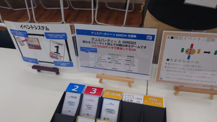 フライト方式は他のイベントでも採用されることが増えましたが、DMEDHとデュエパーティーの交流戦や、回転テーブル戦も遊べるようにしています。」